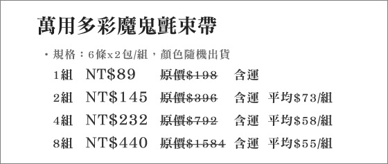 商品訊息簡述: 平均每組最低只要55元起(含運)即可購得萬用多彩魔鬼氈束帶1組/2組/4組/8組(6條x2包/組,顏色隨機出貨)。