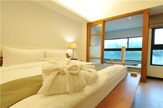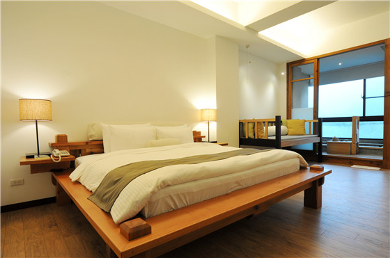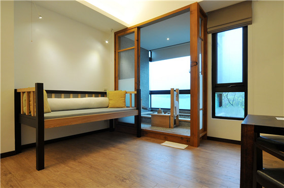 客房內都有一張木作大榻,上面再放置柔軟的軟墊與抱枕,讓客人舒服的坐在上面。坐在榻上還能遙望窗外的山景,軟榻的高度剛好使雙腳騰空,恣意搖晃擺動,讓客人們這個空間裡,彷彿是回到童年時光,頓時忘卻都市間的煩擾。