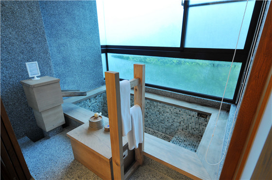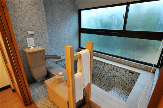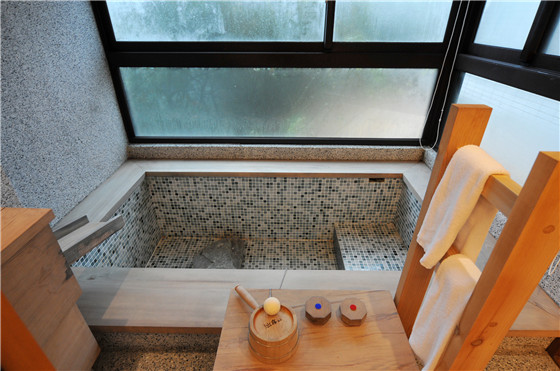 出霧溫泉客房內所有的個人湯池,在仔細砌造後,更特別請到功夫精細的木匠師傅,以珍貴的檜木拼製外框,完全不用任何釘子,檜木本身則完全保留自然色系,僅作多道手續拋磨,呈現出溫潤質樸的外觀。