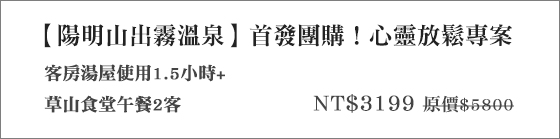 商品訊息簡述: 只要3199元(雙人價)即可享有【陽明山出霧溫泉】 原價5800元首發團購!心靈放鬆專案:客房湯屋使用1.5小時+草山食堂午餐2客。母親節送$1720現金券!消費滿千再抽它X一掃地機器人!