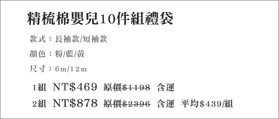 商品訊息簡述: 平均每組最低只要439元起(含運)即可購得精梳棉嬰兒10件組禮袋1組/2組,款式:長袖款/短袖款,顏色:粉/藍/黃,尺寸:6m/12m。